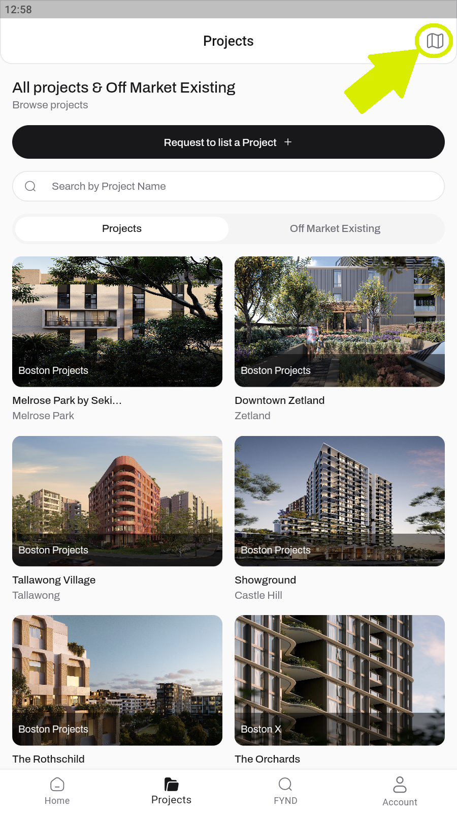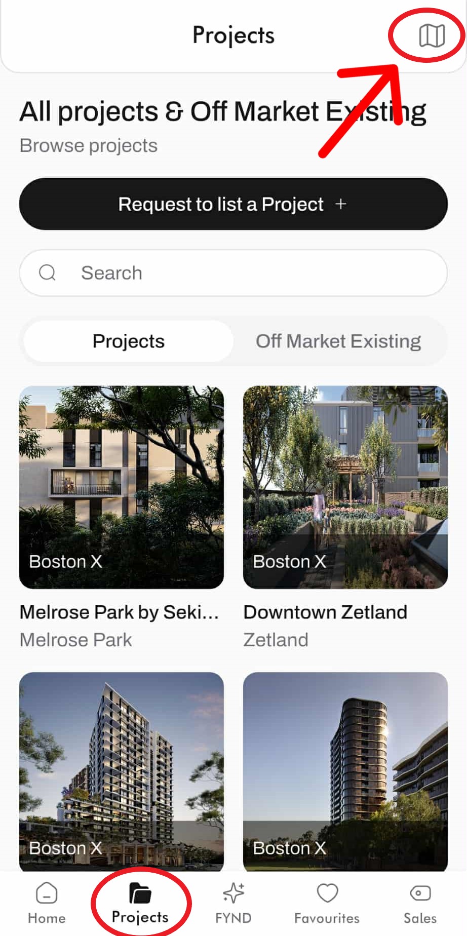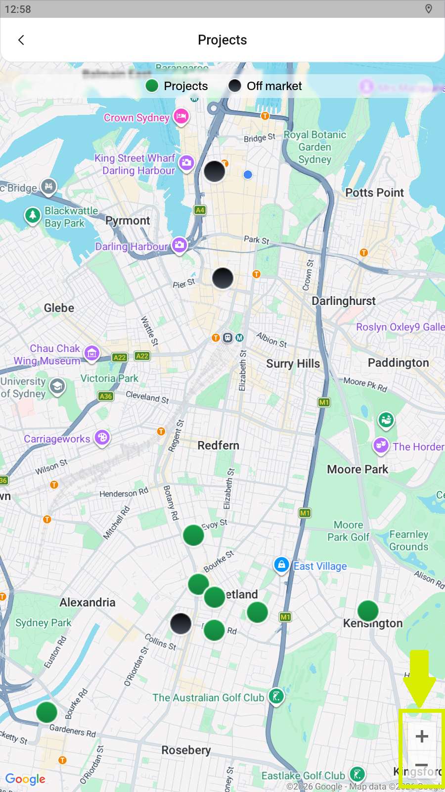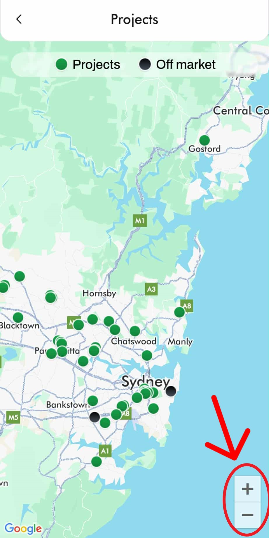 Use “+” to zoom in and look for Black dot on the screen which is the Off Market Listing, Green is Project Listing.